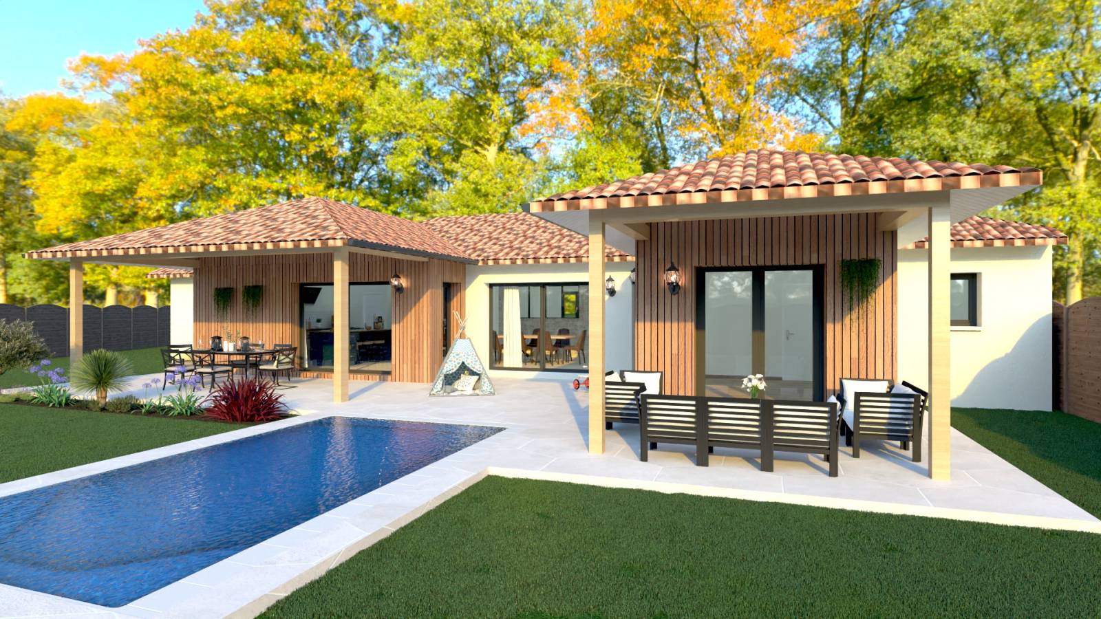 Maison neuve de plain-pied avec piscine, bardage bois et patio ombragé à La Teste-de-Buch proche Bassin d’Arcachon